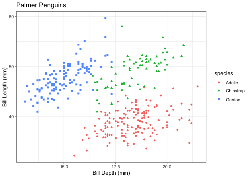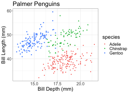 class: title-slide <br> <br> .right-panel[ # More ggplot ## Dr. Mine Dogucu ] --- class: middle .panelset[ .panel[ .panel-name[Plot] <img src="02c-more-ggplot_files/figure-html/unnamed-chunk-2-1.png" style="display: block; margin: auto;" /> ] .panel[ .panel-name[English] - Using the `penguins` data, - Map `bill depth` to x-axis, `bill length` to y-axis, `species` to shape and color. - Add a layer of points and set the size of the points to 4. ] .panel[ .panel-name[R] ```r ggplot(penguins, aes(x = bill_depth_mm, y = bill_length_mm, shape = species, color = species)) + geom_point(size = 4) ``` ] ] --- class: middle ## Labs .panelset[ .panel[ .panel-name[Plot] <img src="02c-more-ggplot_files/figure-html/unnamed-chunk-4-1.png" style="display: block; margin: auto;" /> ] .panel[ .panel-name[English] - Using the `penguins` data, - Map `bill depth` to x-axis, `bill length` to y-axis, `species` to shape. - Add a layer of points and set the size of the points to 4. - .highlight-text[Add labels to x-axis (Bill Depth(mm)), y-axis (Bill Length(mm)), and the title of the plot (Palmer Penguins).] .panel[ .panel-name[R] ```r ggplot(penguins, aes(x = bill_depth_mm, y = bill_length_mm, shape = species, color = species)) + geom_point(size = 4) + * labs(x = "Bill Depth (mm)", * y = "Bill Length (mm)", * title = "Palmer Penguins") ``` ] ] ] --- .left-panel[ ```r ggplot(penguins, aes(x = bill_depth_mm, y = bill_length_mm, shape = species, color = species)) + geom_point() + labs(x = "Bill Depth (mm)", y = "Bill Length (mm)", title = "Palmer Penguins") + * theme_bw() ``` ] .right-panel[ <!-- --> ] --- class: middle ## Themes .panelset[ .panel[ .panel-name[`theme_gray()`] <img src="02c-more-ggplot_files/figure-html/unnamed-chunk-8-1.png" style="display: block; margin: auto;" /> ] .panel[ .panel-name[`theme_bw()`] <img src="02c-more-ggplot_files/figure-html/unnamed-chunk-9-1.png" style="display: block; margin: auto;" /> ] .panel[ .panel-name[`theme_classic()`] <img src="02c-more-ggplot_files/figure-html/unnamed-chunk-10-1.png" style="display: block; margin: auto;" /> ] .panel[ .panel-name[`theme_dark()`] <img src="02c-more-ggplot_files/figure-html/unnamed-chunk-11-1.png" style="display: block; margin: auto;" /> ] .panel[ .panel-name[`theme_minimal()`] <img src="02c-more-ggplot_files/figure-html/unnamed-chunk-12-1.png" style="display: block; margin: auto;" /> ] .panel[ .panel-name[`theme_void()`] <img src="02c-more-ggplot_files/figure-html/unnamed-chunk-13-1.png" style="display: block; margin: auto;" /> ] ] --- .left-panel[ ```r ggplot(penguins, aes(x = bill_depth_mm, y = bill_length_mm, shape = species, color = species)) + geom_point() + labs(x = "Bill Depth (mm)", y = "Bill Length (mm)", title = "Palmer Penguins") + theme_bw() + * theme(text = element_text(size=20)) ``` ] .right-panel[ <!-- --> ] --- ```r ?theme ``` --- class: middle .left-panel[ ```r ggplot(penguins, aes(x = bill_depth_mm, y = bill_length_mm, shape = species, color = species)) + geom_point(size = 4) + * facet_grid(.~species) ``` ] .right-panel[ <img src="02c-more-ggplot_files/figure-html/unnamed-chunk-18-1.png" style="display: block; margin: auto;" /> ] --- class: middle .left-panel[ ```r ggplot(penguins, aes(x = bill_depth_mm, y = bill_length_mm, shape = species, color = species)) + geom_point(size = 4) + * facet_grid(species~.) ``` ] .right-panel[ <img src="02c-more-ggplot_files/figure-html/unnamed-chunk-20-1.png" style="display: block; margin: auto;" /> ] --- class: middle You can do much more in ggplot. - Use images - Make maps - Pick colors that you want -- We don't have time to cover all these. However, as we go along, you will become fluent in reading R code and Googling. You can always ask me too. -- Check out [the ggplot flipbook](https://evamaerey.github.io/ggplot_flipbook/ggplot_flipbook_xaringan.html#1) for some inspiration.