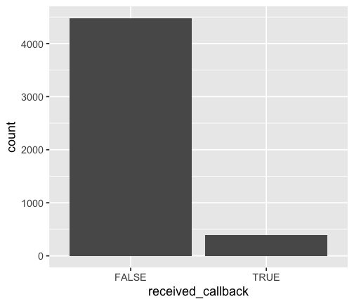 class: title-slide <br> <br> .pull-right[ # Logistic Regression ## Dr. Mine Dogucu ] --- class: middle In all our models, we have worked with numeric response variables. We will now consider categorical response (with two levels) using logistic regression. --- [Are Emily and Greg More Employable than Lakisha and Jamal? A Field Experiment on Labor Market Discrimination](https://www.nber.org/papers/w9873). - Researchers respond to help-wanted ads in Boston and Chicago newspapers with fictitious resumes. -- - They randomly assign White sounding names to half the resumes and African American sounding names to the other half. -- - They create high quality resumes (more experience, likely to have an email address etc.) and low quality resumes. - For each job ad they send four resumes (two high quality and two low quality.) --- ## Data ```r resume <- resume %>% select(received_callback, race, years_experience, job_city) glimpse(resume) ``` ``` ## Rows: 4,870 ## Columns: 4 ## $ received_callback <lgl> FALSE, FALSE, FALSE, FALSE, FALSE, FALSE, FALSE, FA… ## $ race <chr> "white", "white", "black", "black", "white", "white… ## $ years_experience <int> 6, 6, 6, 6, 22, 6, 5, 21, 3, 6, 8, 8, 4, 4, 5, 4, 5… ## $ job_city <chr> "Chicago", "Chicago", "Chicago", "Chicago", "Chicag… ``` --- Response variable: `received_callback` .pull-left[ ```r count(resume, received_callback) %>% mutate(prop = n / sum(n)) ``` ``` ## # A tibble: 2 x 3 ## received_callback n prop ## <lgl> <int> <dbl> ## 1 FALSE 4478 0.920 ## 2 TRUE 392 0.0805 ``` ] .pull-right[ <!-- --> ] --- ## Notation `\(y_i\)` = whether a (fictitious) job candidate receives a call back. `\(\pi_i\)` = probability that the `\(i\)`th job candidate will receive a call back. `\(1-\pi_i\)` = probability that the `\(i\)`th job candidate will **not** receive a call back. --- ### Where is the line? ```r ggplot(resume, aes(x = race, y = received_callback)) + geom_point() ``` <img src="09b-logistic_files/figure-html/unnamed-chunk-6-1.png" style="display: block; margin: auto;" /> --- ## The Linear Model We can model the probability of receiving a callback with a linear model. `\(\text{transformation}(\pi_i) = \beta_0 + \beta_1x_{1i}+\beta_2x_{2i} +.... \beta_kx_{ki}\)` -- `\(logit(\pi_i) = \beta_0 + \beta_1x_{1i}+\beta_2x_{2i} +.... \beta_kx_{ki}\)` -- `\(logit(\pi_i) = log(\frac{\pi_i}{1-\pi_i})\)` -- Note that log is natural log and not base 10. This is also the case for the `log()` function in R. --- class: middle **Probability** `\(\pi_i\)` Probability of receiving a callback. -- **Odds** `\(\frac{\pi_i}{1-\pi_i}\)` Odds of receiving a callback. -- **Logit** `\(log(\frac{\pi_i}{1-\pi_i})\)` Logit of receiving a callback. --- class: middle <img src="09b-logistic_files/figure-html/unnamed-chunk-7-1.png" style="display: block; margin: auto;" /> --- ### When race is black (0) ```r resume %>% filter(race == "black") %>% count(received_callback) %>% mutate(prop = n / sum(n)) ``` ``` ## # A tibble: 2 x 3 ## received_callback n prop ## <lgl> <int> <dbl> ## 1 FALSE 2278 0.936 ## 2 TRUE 157 0.0645 ``` Note that R assigns 0 an 1 to levels of categorical variables in alphabetical order. In this case black (0) and white(1) --- ### When race is black (0) ```r p_b <- resume %>% filter(race == "black") %>% count(received_callback) %>% mutate(prop = n / sum(n)) %>% filter(received_callback == TRUE) %>% select(prop) %>% pull() ``` Probability of receiving a callback when the candidate has a Black sounding name is 0.0644764. --- ### When race is white (1) ```r p_w <- resume %>% filter(race == "white") %>% count(received_callback) %>% mutate(prop = n / sum(n)) %>% filter(received_callback == TRUE) %>% select(prop) %>% pull() ``` Probability of receiving a callback when the candidate has a white sounding name is 0.0965092. --- .pull-left[ ```r p_b ``` ``` ## [1] 0.06447639 ``` ```r ## Odds odds_b <- p_b / (1 - p_b) odds_b ``` ``` ## [1] 0.06892011 ``` ```r ## Logit logit_b <- log(odds_b) logit_b ``` ``` ## [1] -2.674807 ``` ] -- .pull-right[ ```r p_w ``` ``` ## [1] 0.09650924 ``` ```r ## Odds odds_w <- p_w / (1 - p_w) odds_w ``` ``` ## [1] 0.1068182 ``` ```r ## Logit logit_w <- log(odds_w) logit_w ``` ``` ## [1] -2.236627 ``` ] --- .pull-left[ <img src="09b-logistic_files/figure-html/unnamed-chunk-13-1.png" style="display: block; margin: auto;" /> This is THE LINE of the linear model. As x increases by 1 unit, the expected change in the logit of receiving call back is 0.4381802. In this case, this is just the difference between logit for the white group and the black group. ] .pull-right[ The slope of the line is: ```r logit_w - logit_b ``` ``` ## [1] 0.4381802 ``` The intercept is ```r logit_b ``` ``` ## [1] -2.674807 ``` ] --- ```r model_r <- glm(received_callback ~ race, data = resume, family = binomial) ``` ```r tidy(model_r) ``` ``` ## # A tibble: 2 x 5 ## term estimate std.error statistic p.value ## <chr> <dbl> <dbl> <dbl> <dbl> ## 1 (Intercept) -2.67 0.0825 -32.4 1.59e-230 ## 2 racewhite 0.438 0.107 4.08 4.45e- 5 ``` `\(log(\frac{\hat \pi_i}{1-\hat \pi_i}) = -2.67 + 0.438\times racewhite_i\)` --- class: middle center | Scale | Range | |-------------|------------------------| | Probability | 0 to 1 | | Odds | 0 to `\(\infty\)` | | Logit | - `\(\infty\)` to `\(\infty\)` | --- We will consider years of experience as an explanatory variable. Normally, we would also include race in the model and have multiple explanatory variables, however, for learning purposes, we will keep the model simple. ```r model_y <- glm(received_callback ~ years_experience, data = resume, family = binomial) ``` ```r tidy(model_y) ``` ``` ## # A tibble: 2 x 5 ## term estimate std.error statistic p.value ## <chr> <dbl> <dbl> <dbl> <dbl> ## 1 (Intercept) -2.76 0.0962 -28.7 5.58e-181 ## 2 years_experience 0.0391 0.00918 4.26 2.07e- 5 ``` --- ```r model_y_summary <- tidy(model_y) intercept <- model_y_summary %>% filter(term == "(Intercept)") %>% select(estimate) %>% pull() slope <- model_y_summary %